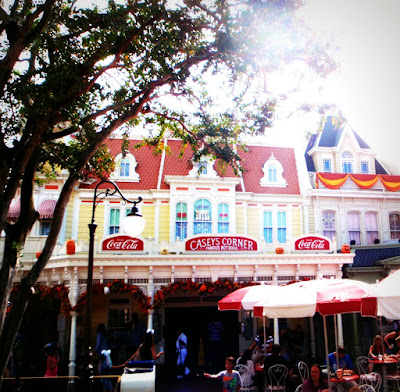 I mentioned in a previous post that we planned on making a meal out of the offerings at The Epcot Food and Wine Festival on our last day. Alas our plan was thwarted by a constant downpour. I didn't have a back up plan, but we had to eat something before leaving for our flight home. Several of the blogs and podcasts I listen to extol the virtues of Casey's Corner. Since we had to pass it on our way out of the park, we thought we'd give it a try.